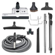 35' Deluxe Central Vacuum Kit comes with a 15" White ET-2 power head, a 35' Cyclo Vac Hose (4923-138T), a Premium Integrated Cord Management Stainless Steel Wand (5370-SEBO), and an Air Only Stainless Steel Telescopic Wand with thumb saver and friction fit (5371-SS). It comes equipped with a ‚Fit All" 12" hardwood floor brush with horsehair, a Crevice Tool, an Upholstery Nozzle, a Dusting Brush, an attachment holder, and a wall mounting hose hanger.