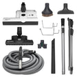 35' Premium Central Vacuum Kit comes with a 15" White ET-2 power head, a 35' Cyclo Vac Hose (4923-138T), a Premium Integrated Cord Management Stainless Steel Wand (5370-SEBO), and an Aluminum Air Only Telescopic Wand (5371-SEBO). It comes equipped with a Premium Parquet Brush (7200GS), a Crevice Tool, an Upholstery Nozzle, a Dusting Brush, an attachment holder, and a wall mounting hose hanger.