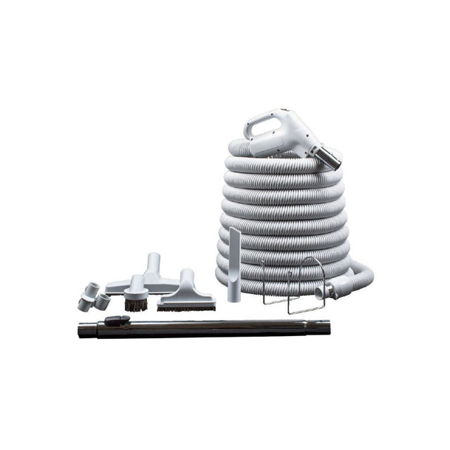 All central vacuum hoses are 30' long and have the same diameters.The telescopic adjustable wand and the natural bristle floor brush on this kit is perfect for all types of hard wood floors and natural stones cleaning. You also get 3 attachments and a hose hanger with this kit.
